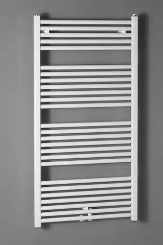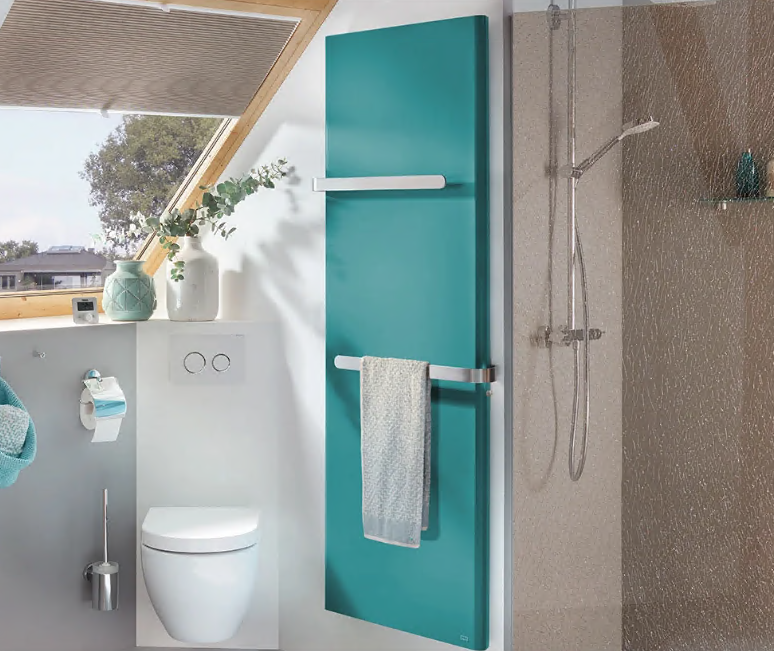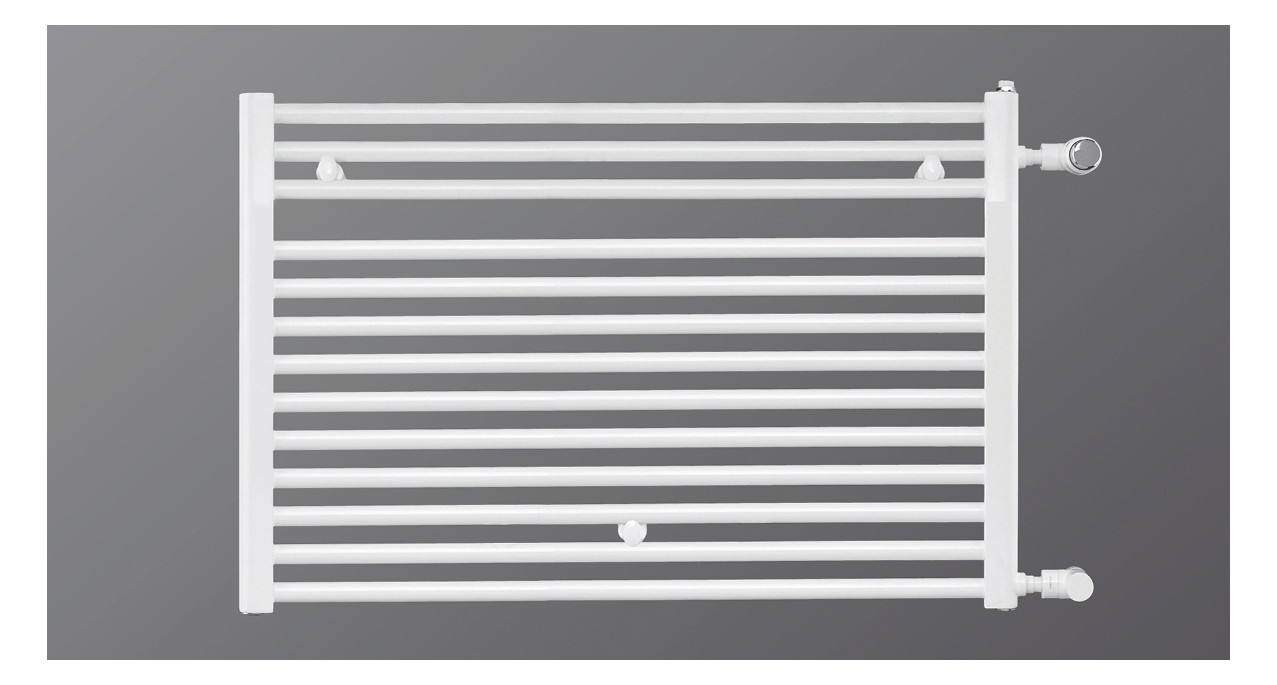 für den Zentralheizungsbetrieb (zusätzliche Ausstattung mit Elektroheizstab) mit planer Front, feinen Seitenlinien und seitlichen Schatten (Licht)-fugen. Grundkörper ohne Konvektionslamellen in geschweißter Ausführung aus horizontalen Rundrohren 35 mm und zweireihig vertikal angeordneten Flachprofilrohren 50 x 10 mm, pulverbeschichtet. Die Seiten der Front sind im 60° Winkel nach innen gestellt und lassen eine Fuge zur Wand für Schatten oder Licht frei. Die Seiten haben einen verdeckten Falz zur Aufnahme der optional lieferbaren LED-Hinterleuchtung. Plane Front verblendet harmonisch die komplette Ventilgarnitur mit Mittenanschluss DN 15 (1/2″) x 50 mm für Vorlauf links oder rechts und Eck-Anschluss mit Eurokonus für Klemmringverschraubung, lediglich der Bedienknauf des optionalen Thermostaten ist sichtbar. Zusätzlicher Anschluss für Elektroheizstab DN 15 (1/2″) von unten links. Gebrauchsmuster Nr. 202011109465.4, Geschmacksmuster Nr. 001942178. Oberfläche der Front und der Seiten umweltfreundlich, emmissionsfrei pulverbeschichtet DIN 55900 und bei ca. 180 °C eingebrannt. Serienmäßiges Zubehör: Ventilgarnitur bestehend aus Thermostatventil voreinstellbar, Rücklaufverschraubung und Anschlussteilen, Entlüftungsstopfen DN8 (1/4″) und 1 Wandträger mit Schrauben und Dübeln. Optional: Handtucharm/e links/rechts für Einsatz in Küche und Bad. Optional: LED-Hinterleuchtung als Design- und Orientierungslicht. Heizmedium Wasser: max. zul. Betriebstemperatur 100 °C, max. zul. Betriebsüberdruck 6 bar.